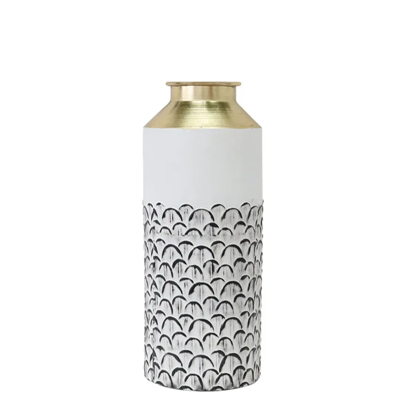 ΔΙΑΚΟΣΜΗΤΙΚO ΜΕΤΑΛΛΙΚΟ ΒΑΖΟ - ΧΡΩΜΑ: ΧΡΥΣΟ/ΜΑΥΡΟ/ΛΕΥΚΟ - ΣΧΕΔΙΟ: ΜΠΟΥΚΑΛΙ ΦΟΛΙΔΩΤΟ ΜΟΤΙΒΟ - ΚΙΒ: 4 ΔΙΑΣΤΑΣΕΙΣ / DIMΕNSIONS: Φ17.8x48.9cm DECORATIVE METAL VASE - COLOR: GOLD/BLACK/WHITE - DESIGN: BOTTLE SCALE PATTERN - BOX: 4